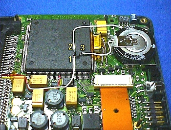 《配線》 ◆ ショットキーバリアダイオードの"N9"と刻印された表面に、両面テー プを貼り、ホーネットCPU の上に貼り付ける。(裏返しの形) ◆ 配線は以下の3本(白リード線)です。 1)タンタルコンデンサ (+側) とショットキバリアダイオード(1ピン) 2)ショットキバリアダイオード(2ピン)と Backup ホルダーのプラス 側ステンレス板 3)ショットキバリアダイオード(3ピン)と電気二重層コンデンサの プラス端子 ◆ 最後にショットキーバリアダイオードと電気二重層コンデンサの上 に絶縁テープを貼る。 |