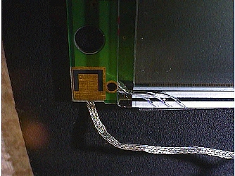 液晶フレキの両端をテスターで計り、断線していないか導通を調べます。断線個所が見つかったら、根元の茶色い被服をカッター